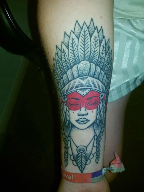 女生手臂上黑灰素描点刺技巧创意印第安风格女生人物纹身图片