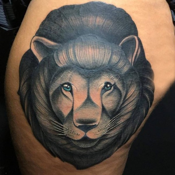 女生大腿上黑灰素描点刺技巧创意狮子头纹身图片