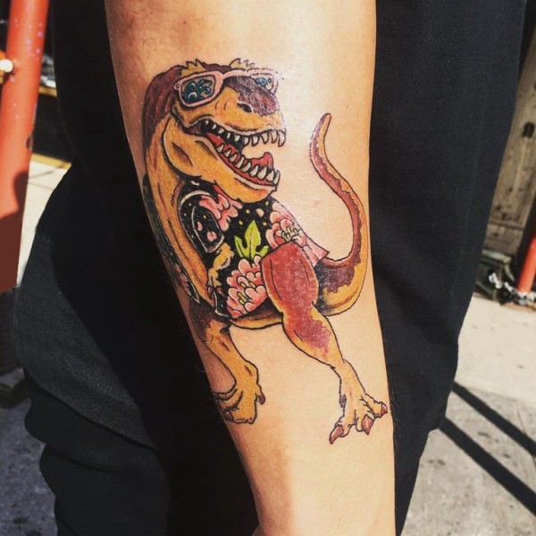 男生手臂上彩绘水彩创意恐怖恐龙纹身图片