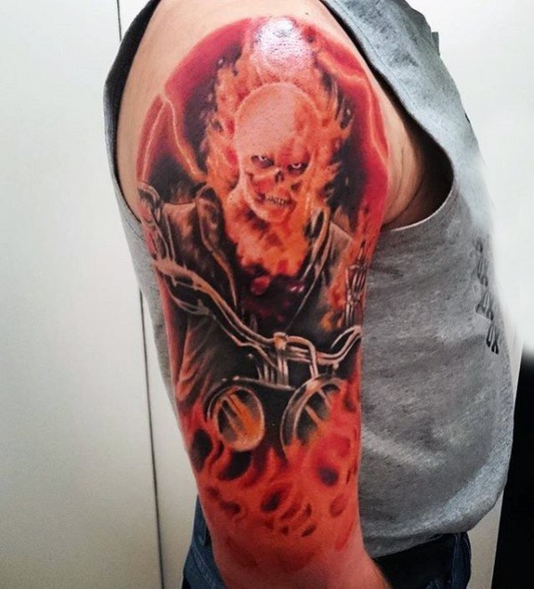 神秘的彩绘渐变抽象线条火焰和人物幽灵骑士纹身图案