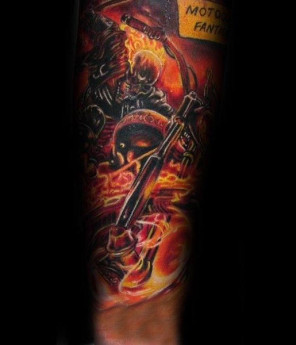 神秘的彩绘渐变抽象线条火焰和人物幽灵骑士纹身图案