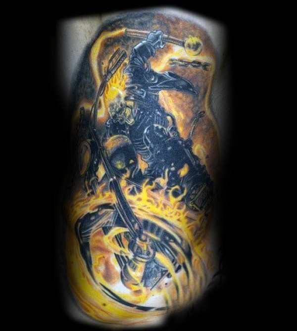 神秘的彩绘渐变抽象线条火焰和人物幽灵骑士纹身图案