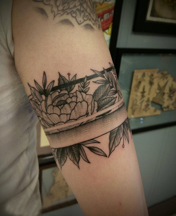 女生手臂上黑灰素描点刺技巧创意文艺唯美花朵花环纹身图片