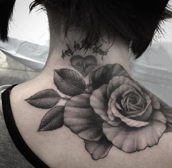 女生颈后黑灰点刺简单线条植物玫瑰纹身图片