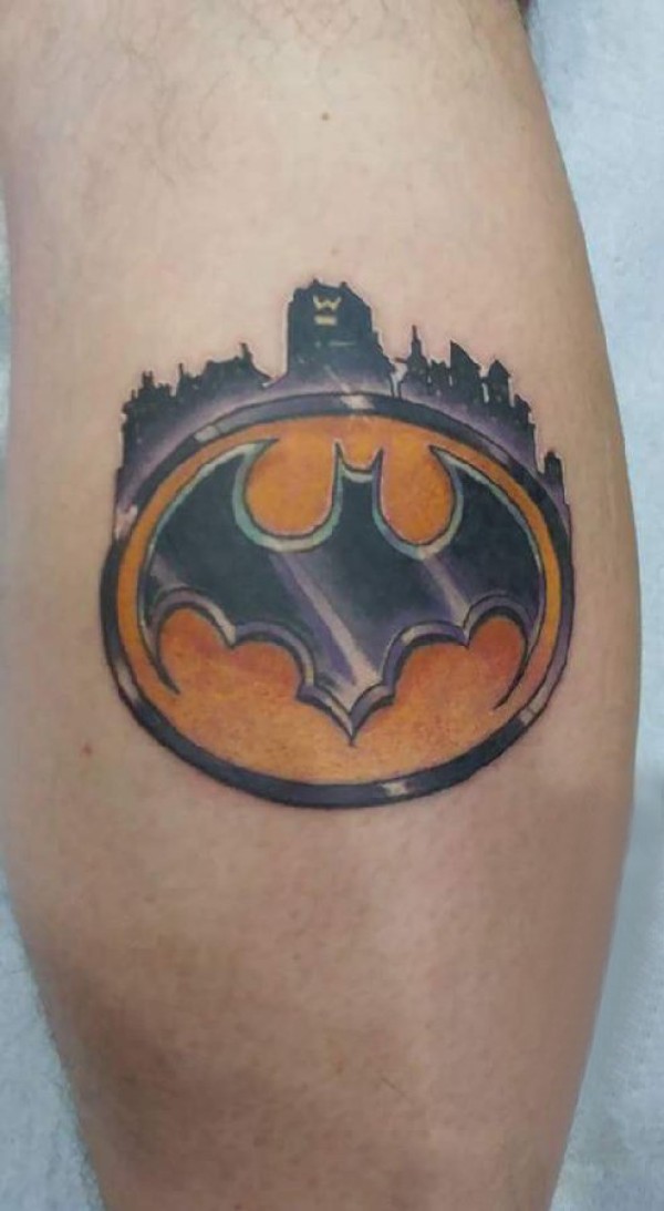 男生小腿上彩绘渐变几何简单线条蝙蝠侠符号纹身图片