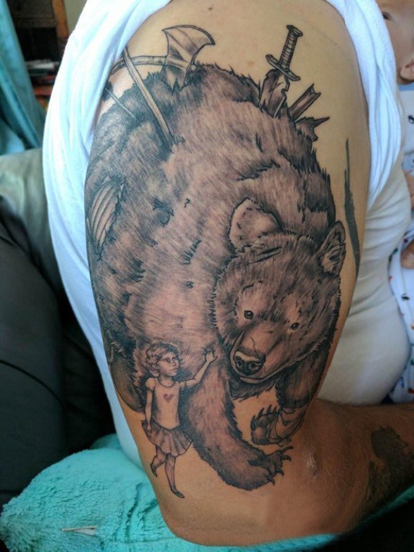 男生手臂上黑色点刺简单线条人物和熊纹身图片