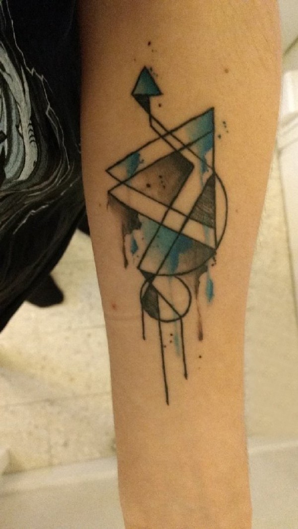 男生手臂上黑色线条几何元素水彩泼墨纹身图片