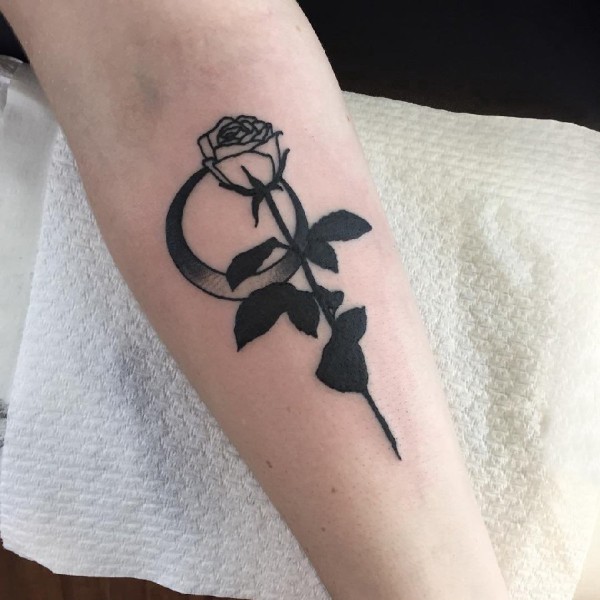 女生手臂上黑色点刺简单线条月亮和植物玫瑰纹身图片