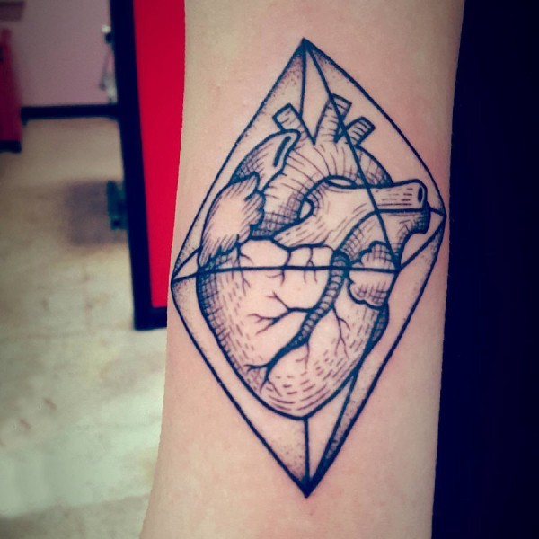 女生手臂上黑色点刺立体几何简单线条心脏纹身图片