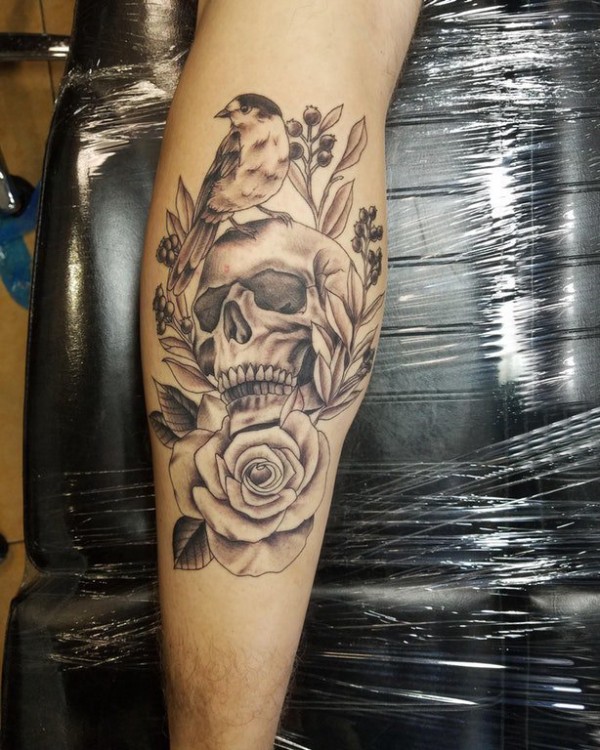 男生小腿上黑灰点刺简单线条植物花朵和骷髅纹身图片