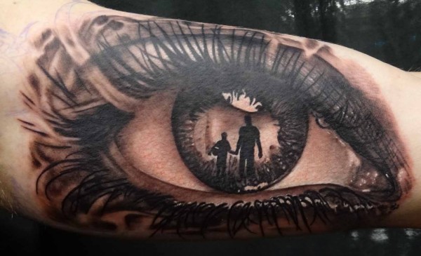 男生手臂上黑灰素描点刺技巧文艺唯美精致眼睛纹身图片