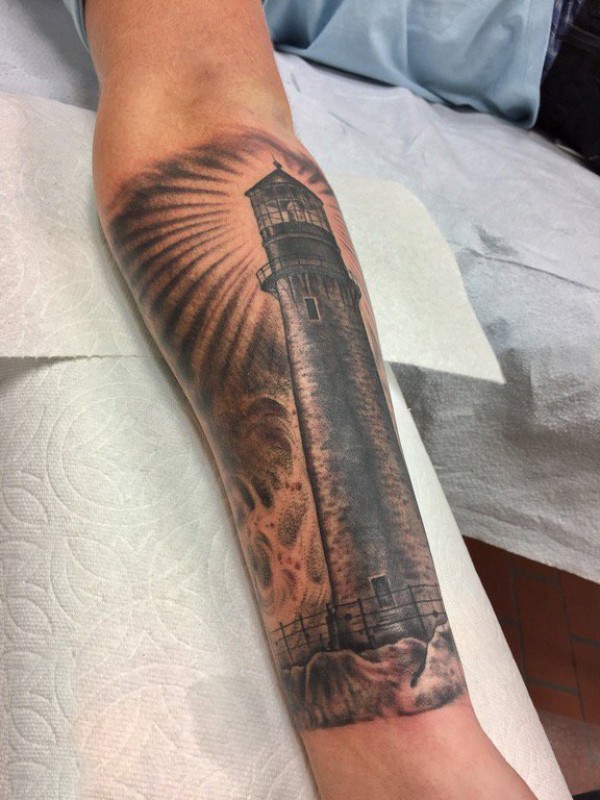 男生手臂上黑灰素描点刺技巧文艺灯塔纹身图片
