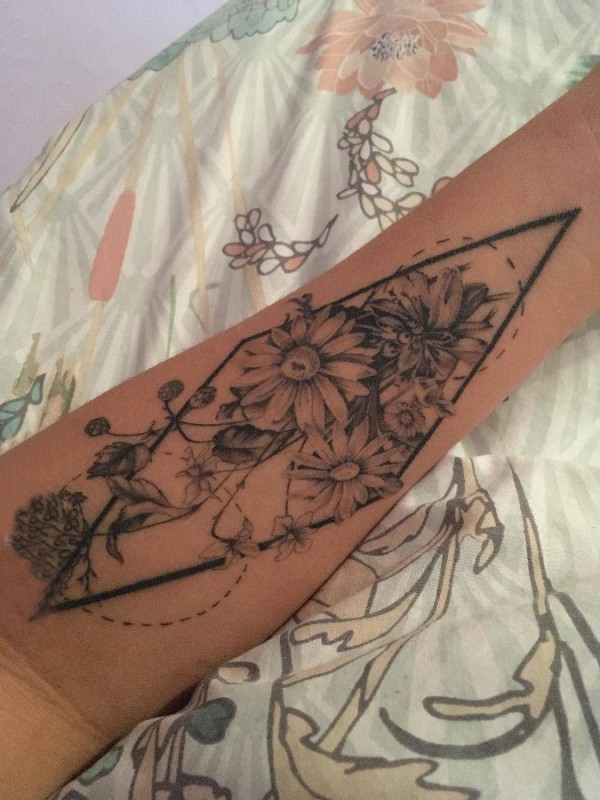 女生手臂上黑色线条几何元素唯美花朵纹身图片