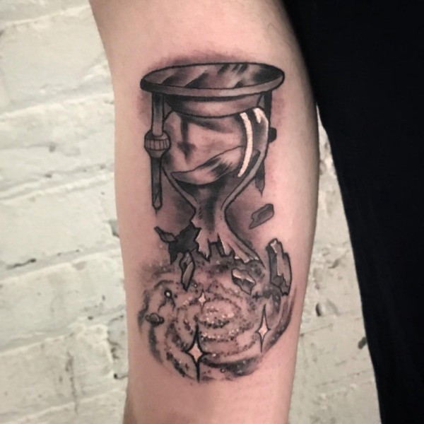 男生手臂上黑色点刺抽象线条星空和沙漏纹身图片