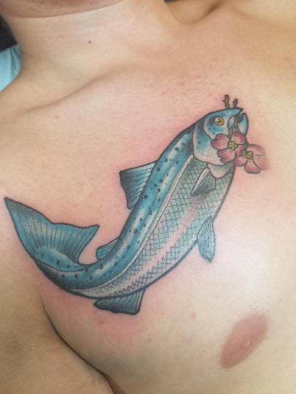 纹身招财鱼 男生胸部花朵和鱼纹身图片