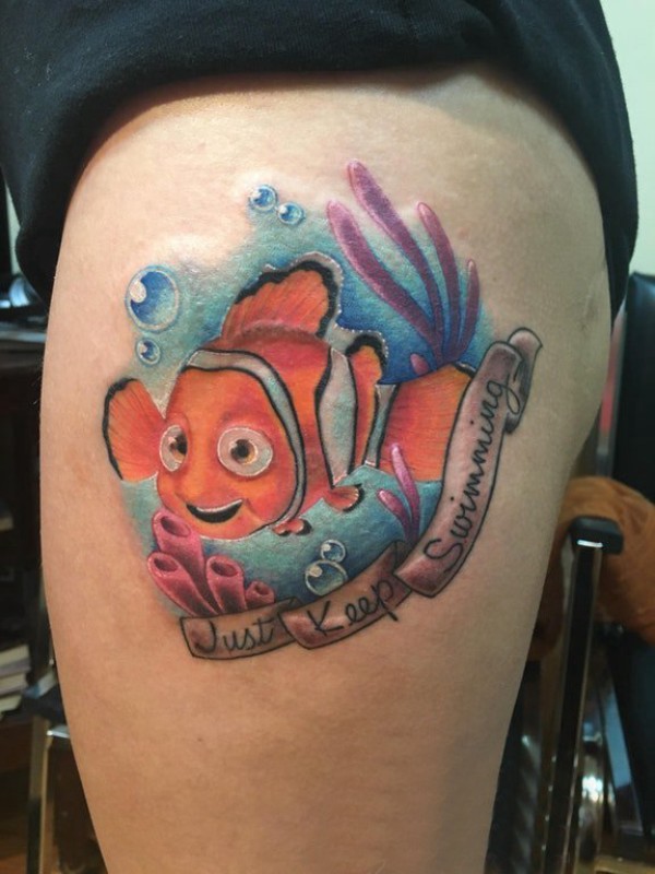 纹身卡通 女生大腿上彩色的小丑鱼纹身图片