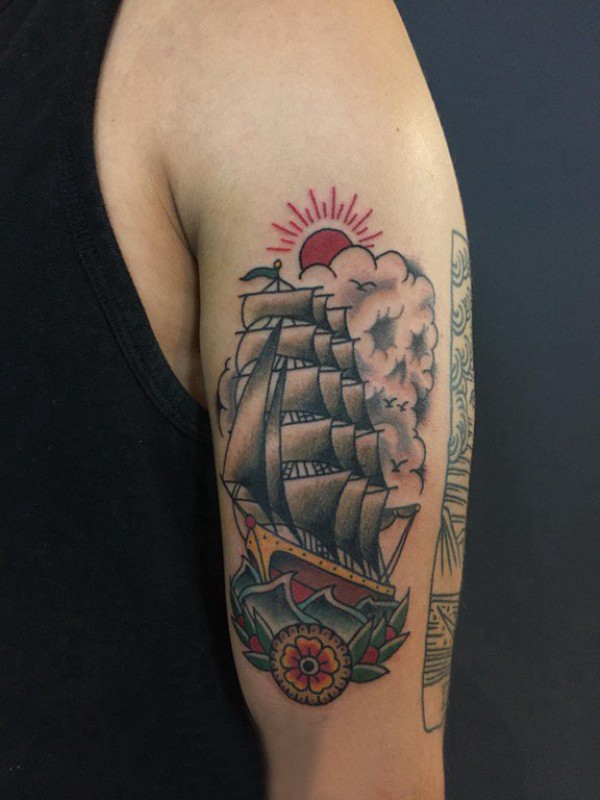 纹身小帆船 男生大臂上彩色花朵和帆船纹身图片