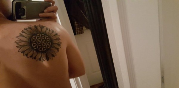 向日葵纹身图片 女生后肩上黑色的向日葵纹身图片