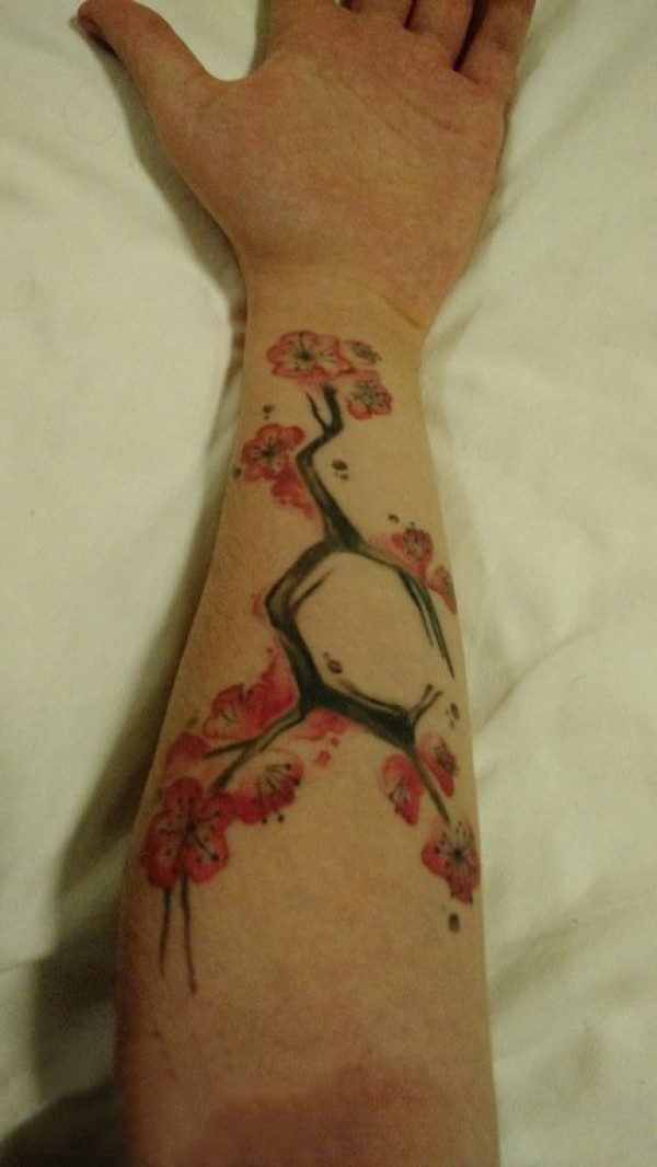 手臂纹身素材 女生手臂上化学元素和樱花纹身图片