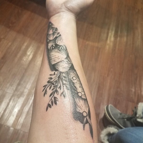 欧美匕首纹身 男生手臂上植物和匕首纹身图片