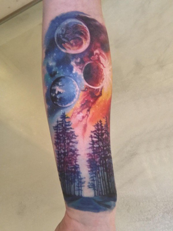 手臂纹身素材 男生手臂上星球和大树纹身图片