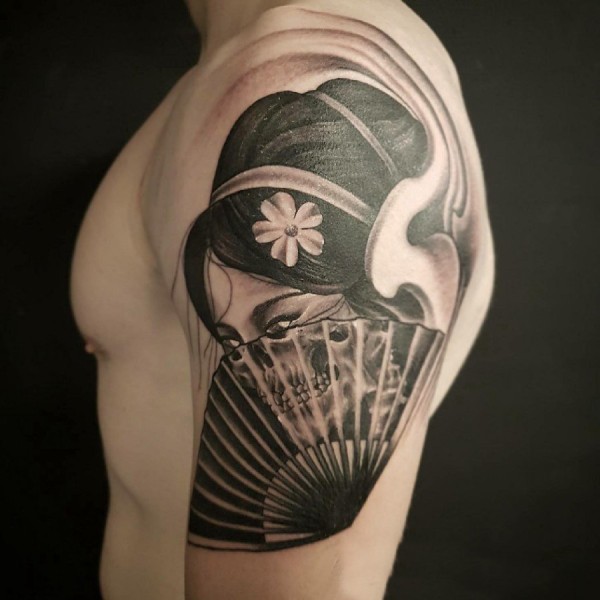 双大臂纹身 男生大臂上黑色的艺妓纹身图片