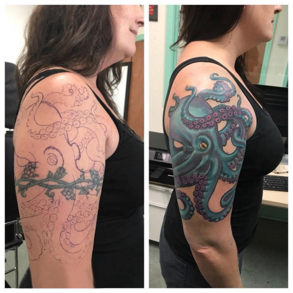 纹身覆盖 女生大臂上彩色的章鱼纹身图片