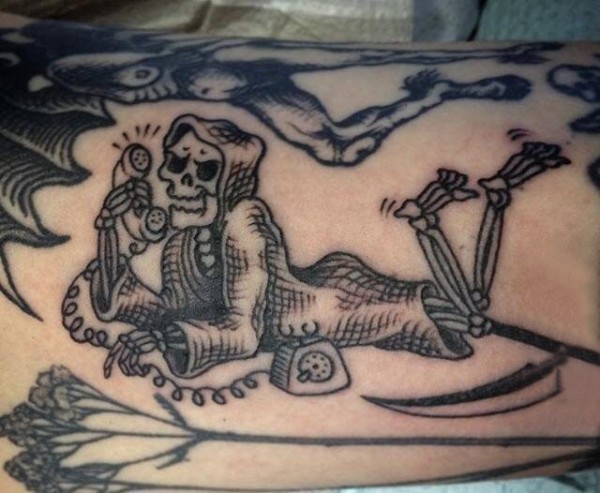 双大臂纹身 男生大臂上打电话的骷髅纹身图片