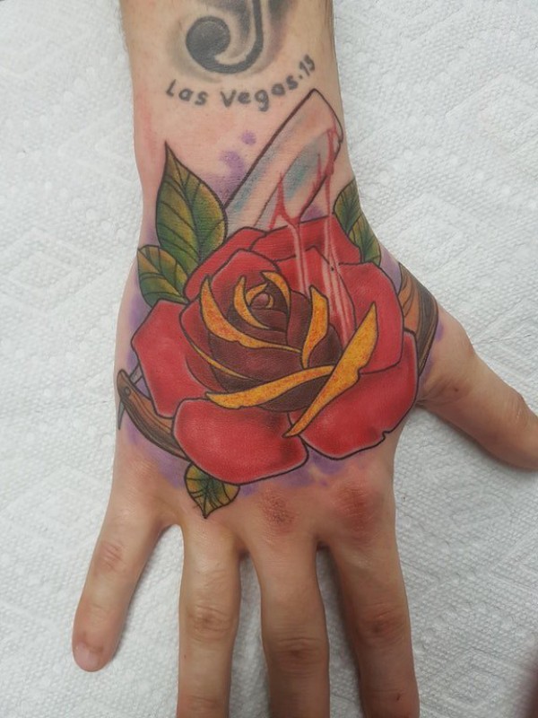 手背纹身 男生手背上彩色的玫瑰纹身图片