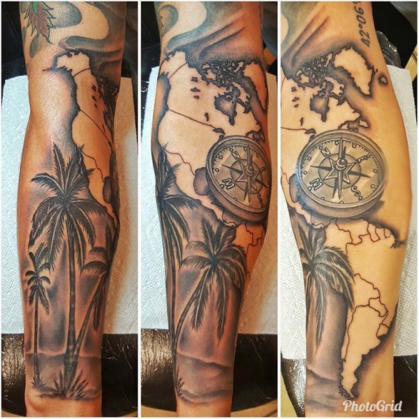 手臂纹身素材 男生手臂上指南针和椰树纹身图片