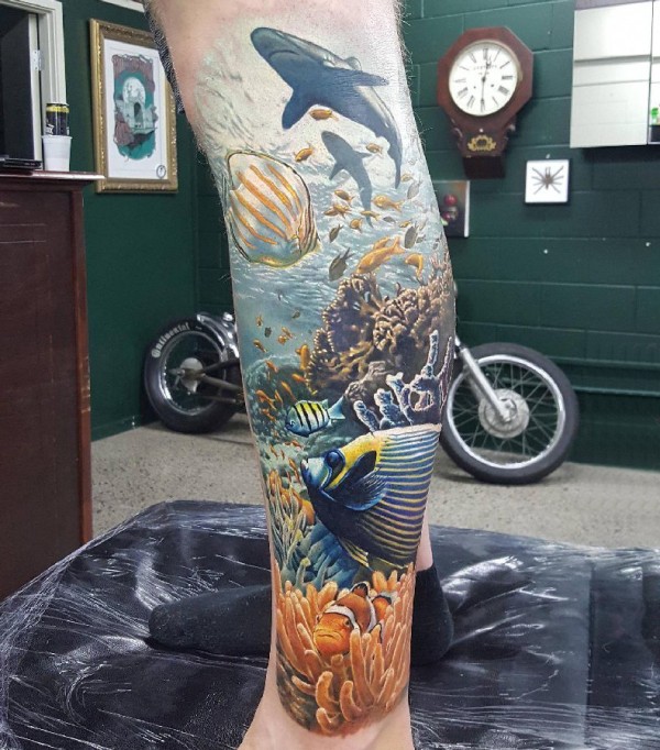 欧美小腿纹身 男生小腿上彩色的海底风景纹身图片
