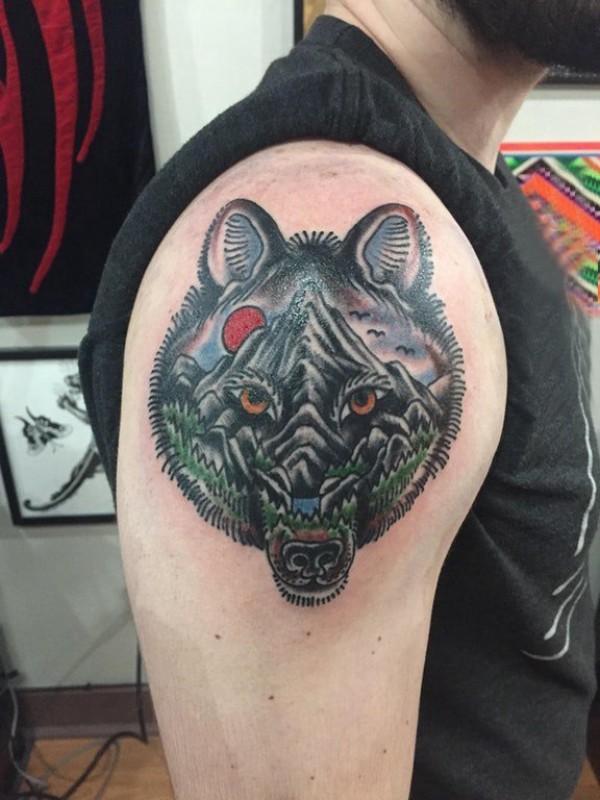 狼头纹身 男生大臂上狼头和风景纹身图片