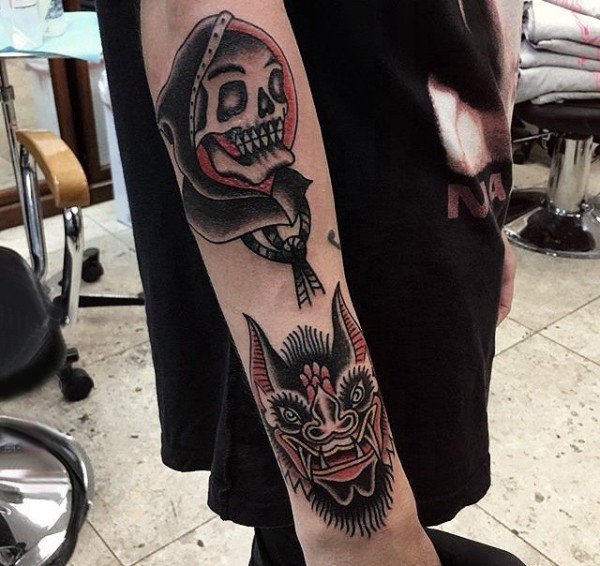 手臂纹身 男生手臂上神兽和骷髅纹身图片