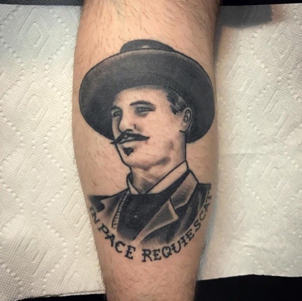 人物肖像纹身 男生小腿上素描的人物肖像纹身图片