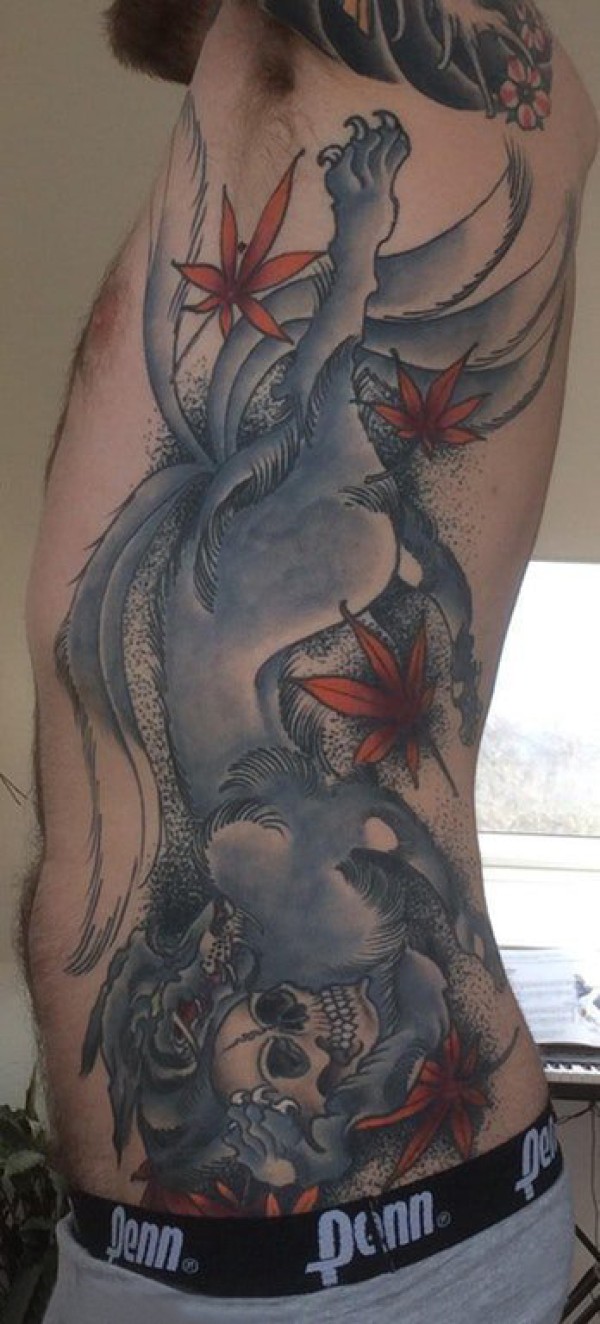 九尾狐狸纹身图片 男生侧腰上彩绘的九尾狐纹身图片