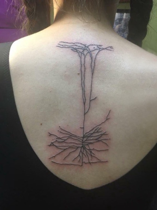 极简线条纹身 女生后背上黑色的极简线条纹身图片