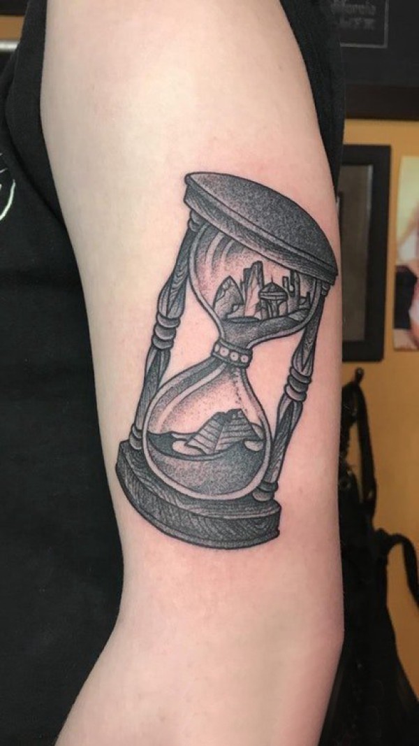 纹身沙漏 男生手臂上沙漏和建筑物纹身图片