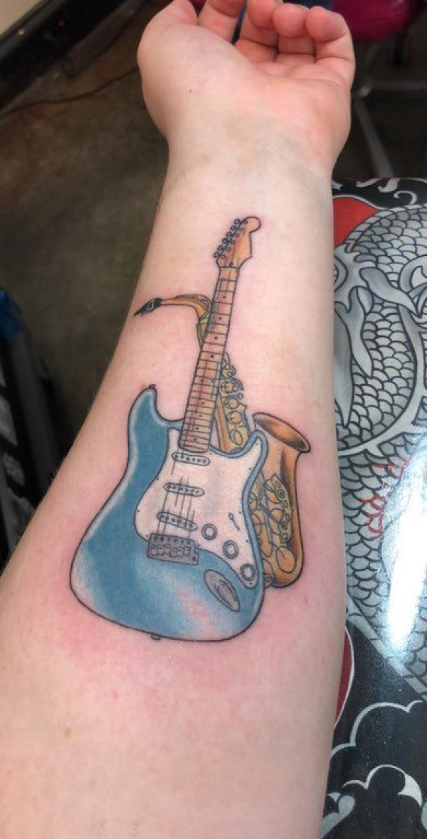 电吉他纹身 女生手臂上萨克斯和吉他纹身图片