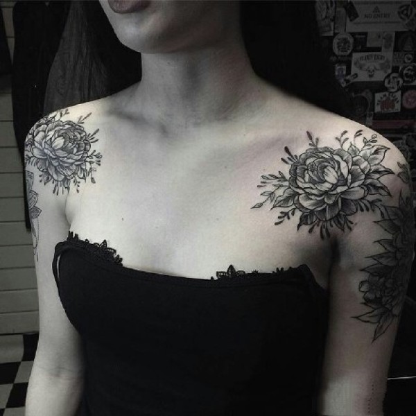 女生肩花纹身_15张女性双肩对称的肩花纹身图案作品图片