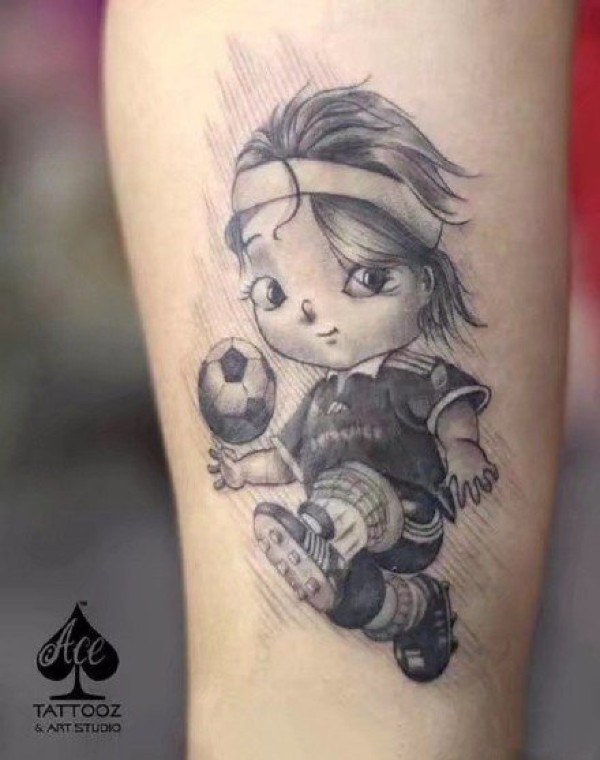 男生手臂上黑色几何线条卡通足球和人物纹身图片