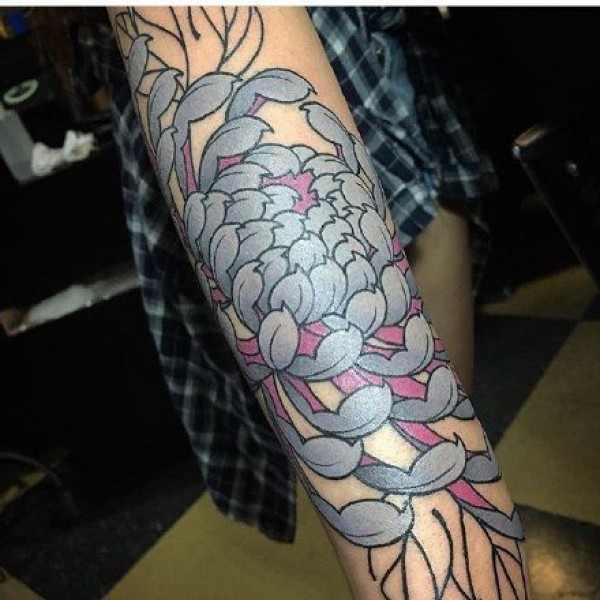 纹在手臂胳膊上的黑灰素花花卉纹身图案欣赏