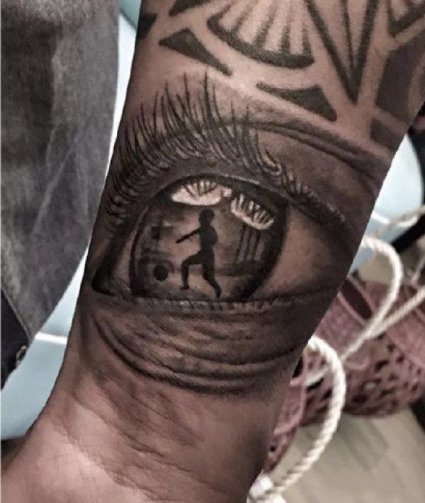 男生手臂上黑色几何线条卡通足球和人物纹身图片