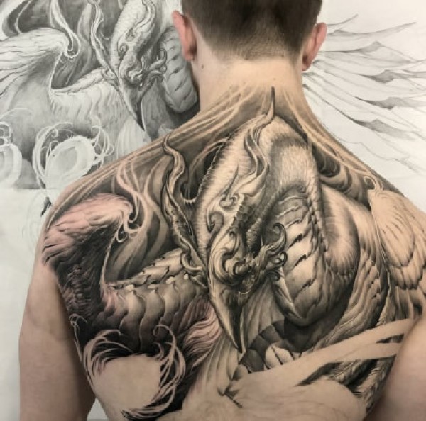 女生背部黑灰素描点刺技巧霸气大面积满背翅膀纹身图片