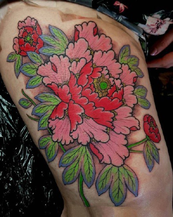 传统风格的一组彩色牡丹等花卉纹身图案欣赏