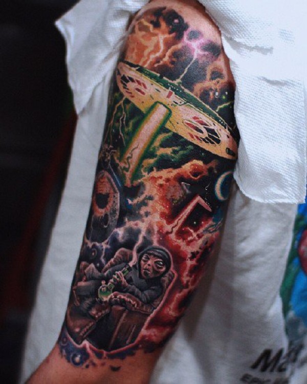 科幻主题,UFO,外星人等元素的满背纹身