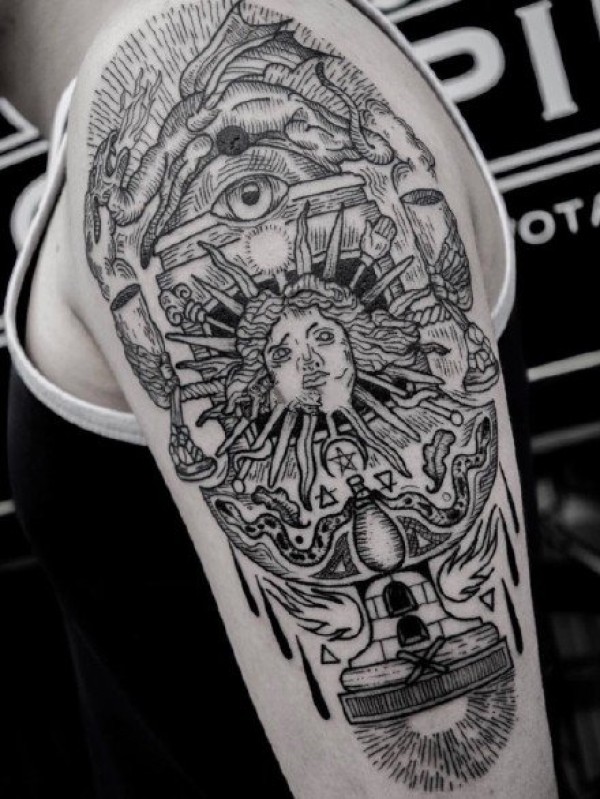 胳膊上好看的一组小面积的黑灰纹身图案欣赏