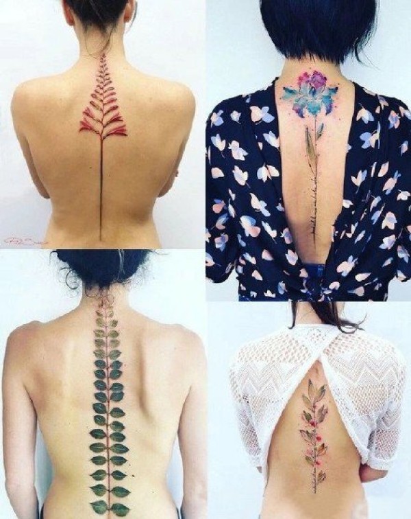 女性背部脊柱上的花朵纹身作品图片9张