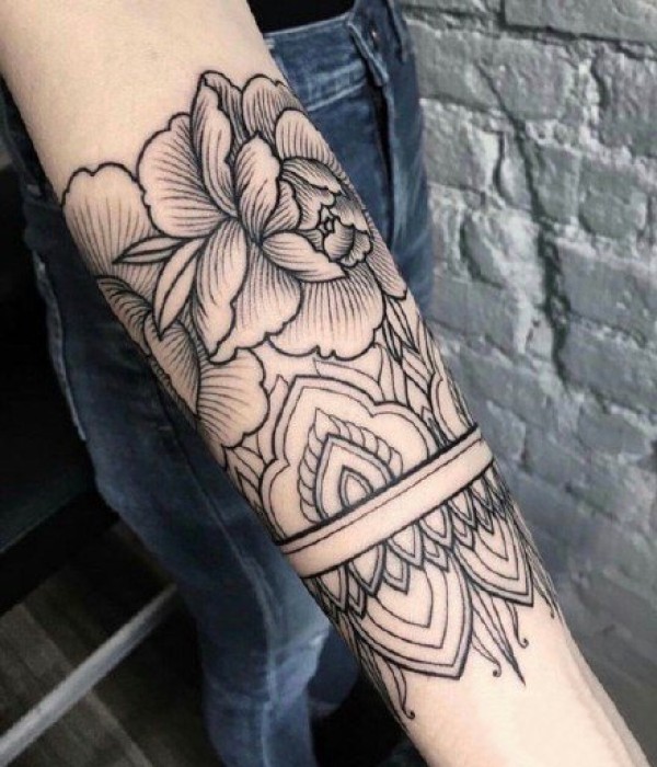 环绕在手臂上很好看的一组黑灰花卉主题纹身图案