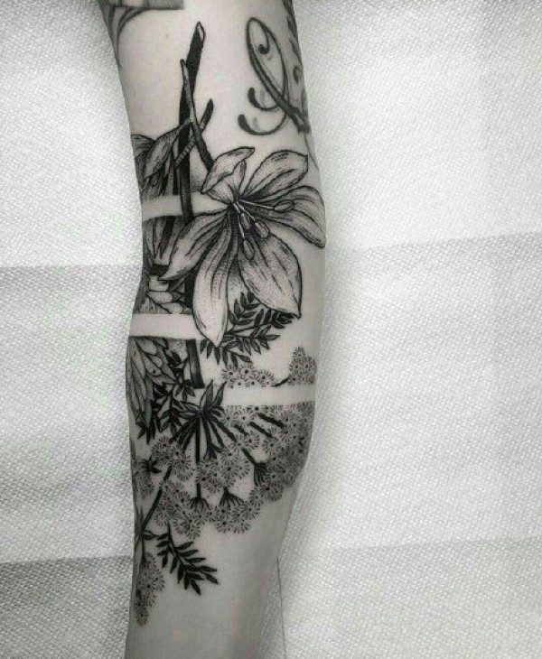 环绕在手臂上很好看的一组黑灰花卉主题纹身图案