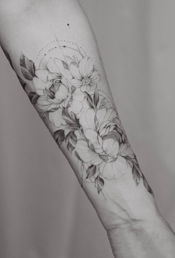 环绕在手臂上很好看的一组黑灰花卉主题纹身图案